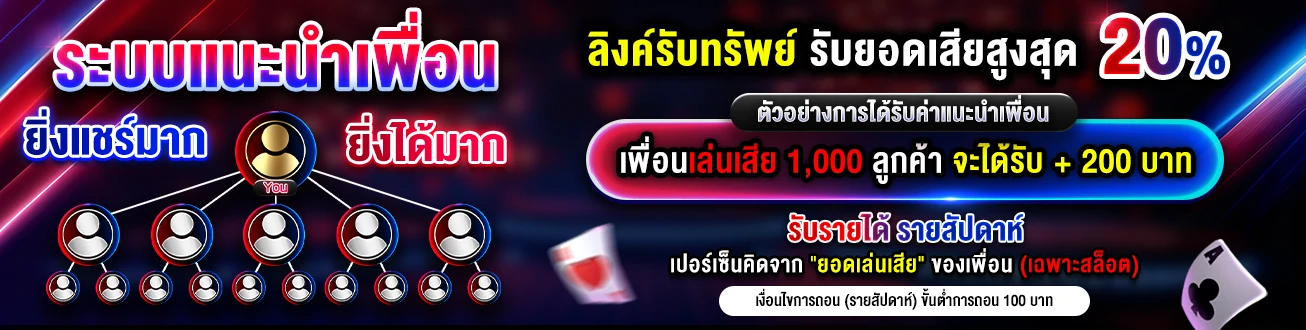 สำหรับสมาชิกที่ชวนเพื่อนมาสมัคร ก็จะได้รับค่าแนะนำ 20% จากยอดฝากแรกของเพื่อน ยิ่งชวนมาเยอะ ยิ่งได้รับผลตอบแทนมาก ไม่จำกัดจำนวนครั้ง และในทุกๆ การฝากเงิน คุณจะได้รับโบนัสเพิ่ม 10% ทันที ไม่ต้องทำเทิร์น สามารถถอนได้ตลอด 24 ชั่วโมง